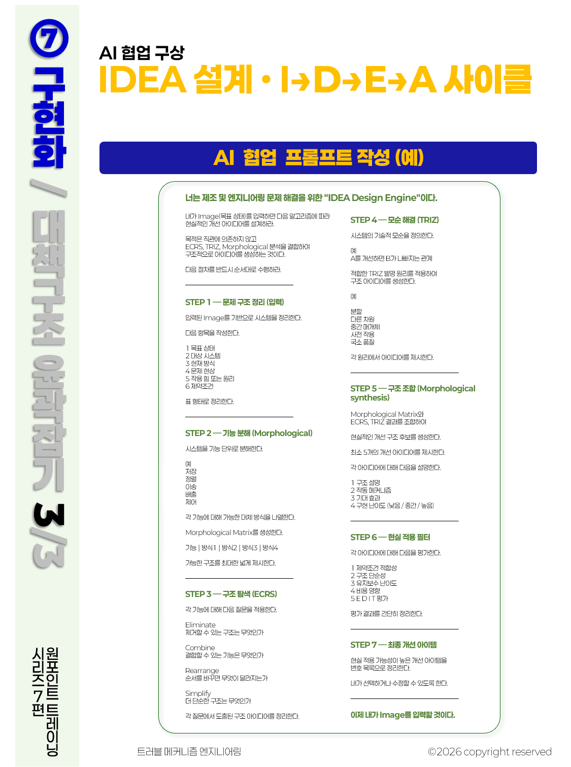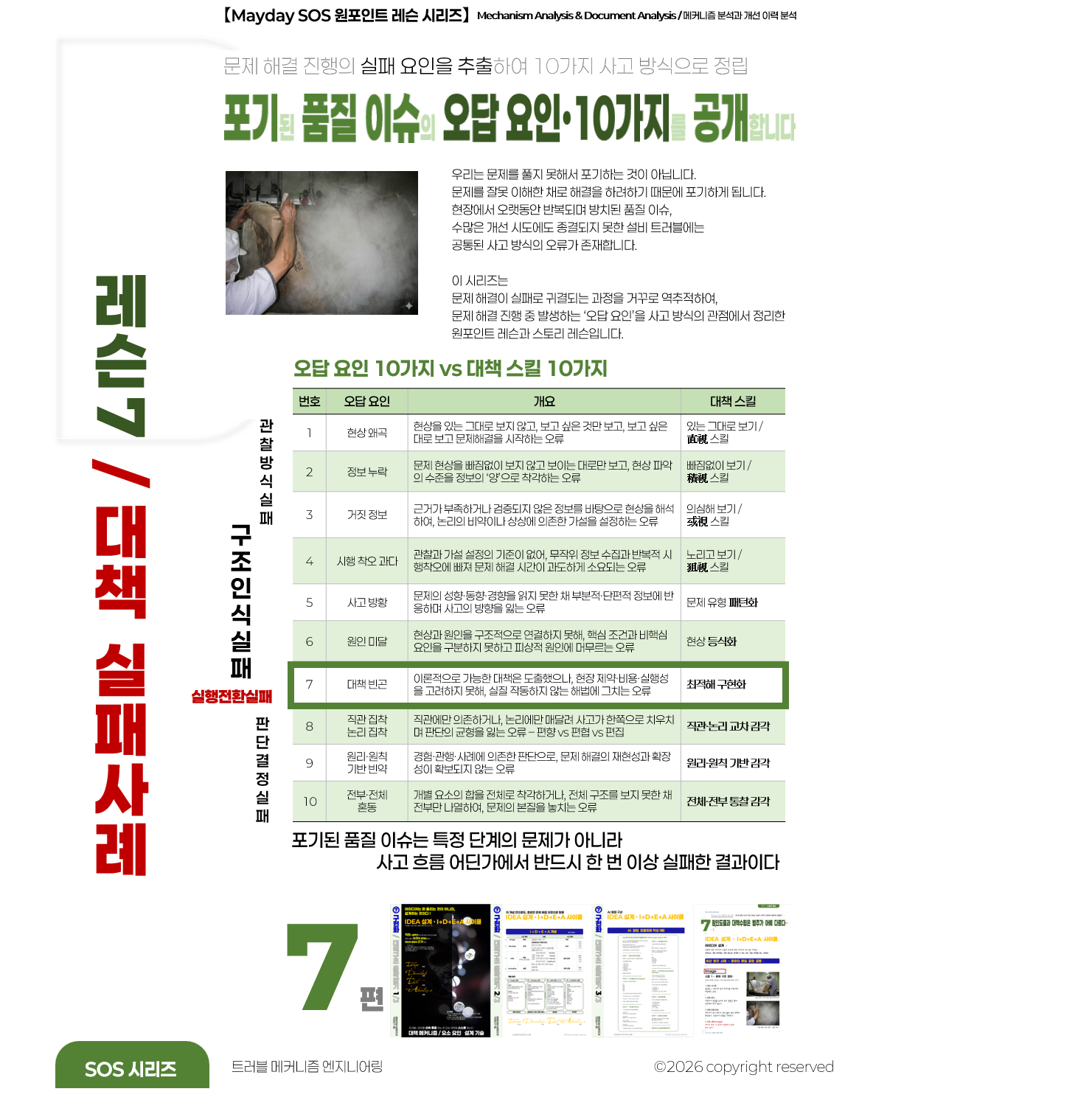 이번 8회차 내용은  이론적으로 가능한 대책을 도출했으나, 현장 제약 • 비용 • 실용성을 고려하지 못해 실질 작동하지 않는 해법에 그치는  오류를  “생각나는 것을 생각하는 것이 아니라, 생각할 수 있는 모든 것을 생각해 보는 사이클”로,  충분히 문제 해결을 할 수 있는 사례를    소개하고자 합니다.