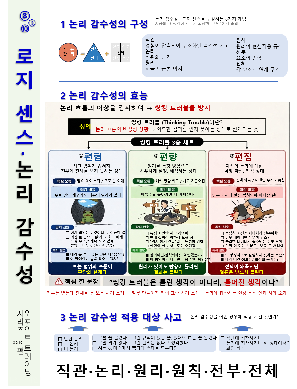 ʺ로지 센스 6항목(직관•논리•원리•원칙•전부•전체)과 3대 씽킹 트러블 박멸(편협•편향•편집)ʺ 로  어려운  문제를  해결을  하는『문제해결•하이엔드 기술』